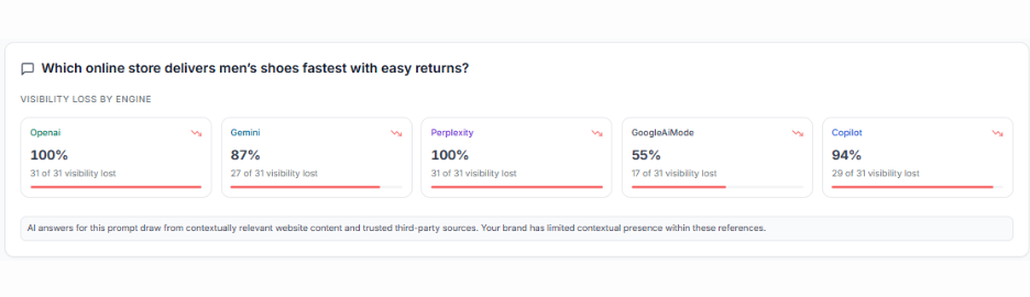 Visibility loss is analyzed across major AI engines, including: