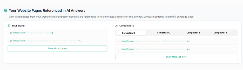 By comparing referenced pages, teams can identify coverage gaps and understand why competitors are being cited instead.