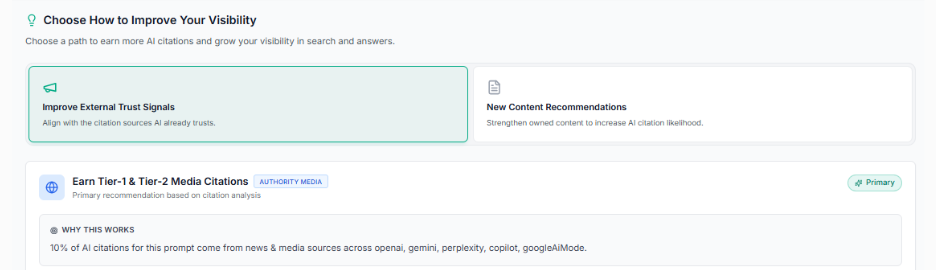 The Action Center highlights when stronger external signals are needed and encourages teams to align with sources that AI already trusts.